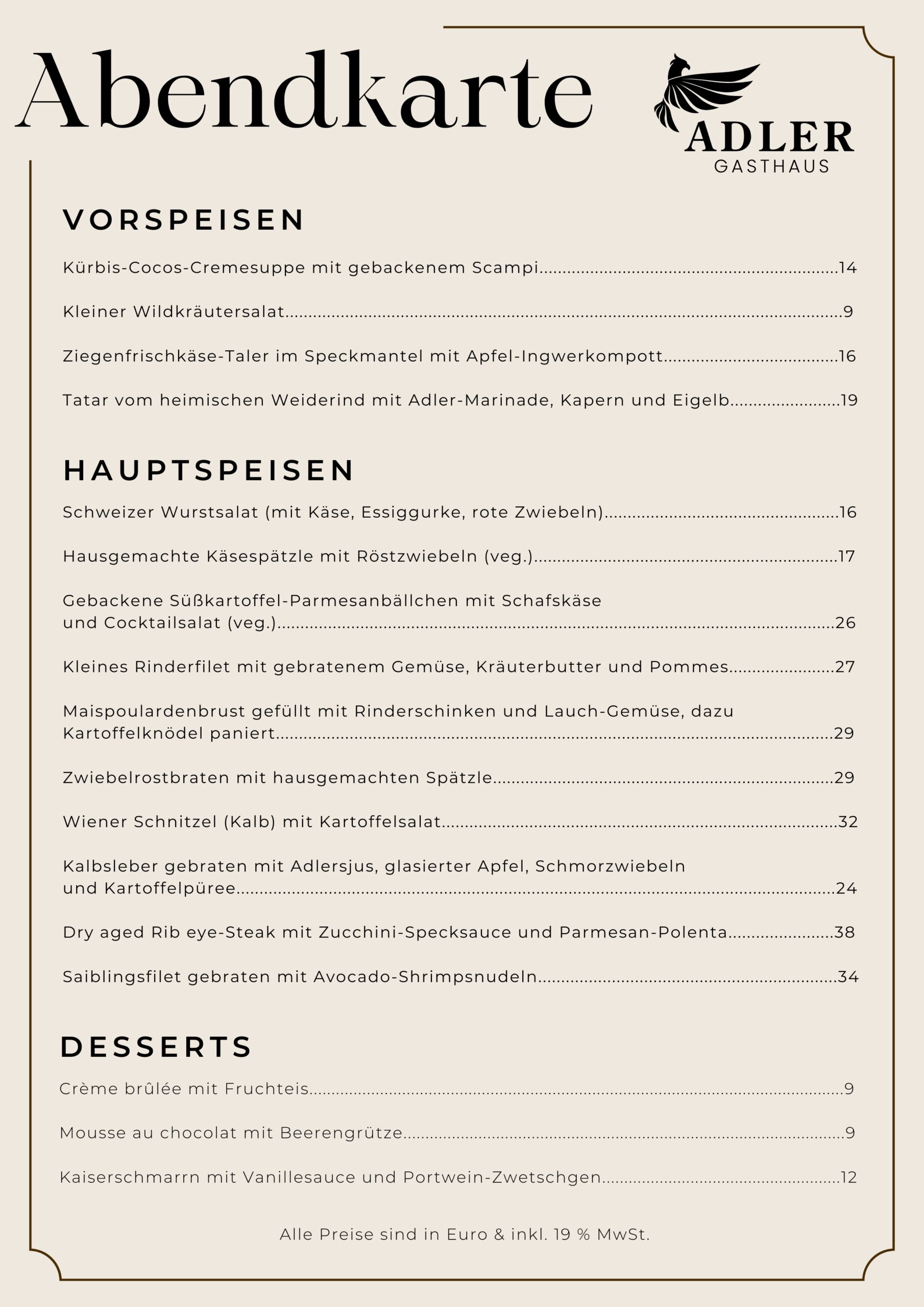 Auf unserer Abendkarte finden Sie Klassiker der süddeutschen Küche, kreative Eigenkreationen und vegetarische Spezialitäten, die alle eines gemeinsam haben: Sie werden mit Leidenschaft und besten Zutaten zubereitet.